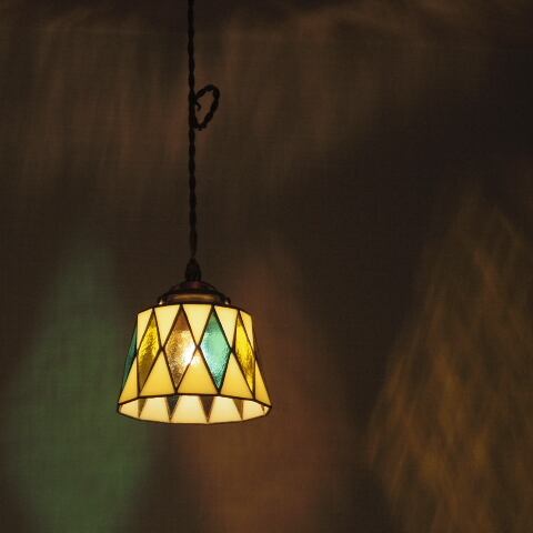レモンイエロー、ターコイズブルー、ブラウンの色ガラスを使っています。